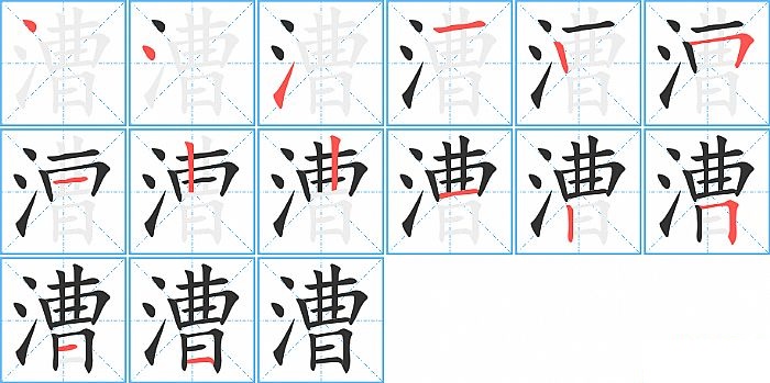 漕是左右结构,漕的部首是“氵”,部外笔画11画,总笔画14画,漕的笔画顺序是“点、点、提、横、竖、横折、横、竖、竖、横、竖、横折、横、横”。看看“漕”字什么意思 >>