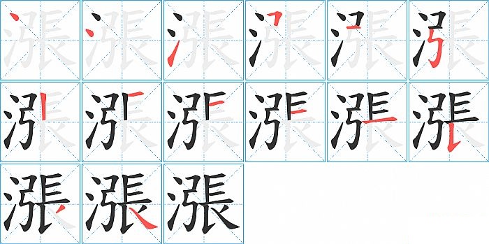 漲是左右结构,漲的部首是“氵”,部外笔画11画,总笔画14画,漲的笔画顺序是“点、点、提、横折、横、竖折折钩、横、竖、横、横、横、竖提、撇、捺”。看看“漲”字什么意思 >>