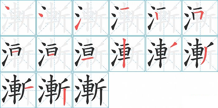 漸是左右结构,漸的部首是“氵”,部外笔画11画,总笔画14画,漸的笔画顺序是“点、点、提、横、竖、横折、横、横、横、竖、撇、撇、横、竖”。看看“漸”字什么意思 >>