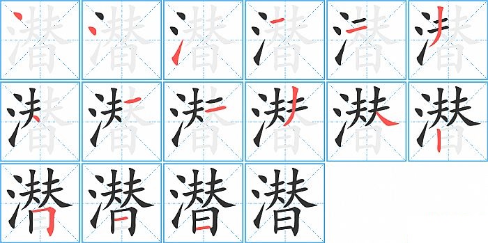 潜是左右结构,潜的部首是“氵”,部外笔画12画,总笔画15画,潜的笔画顺序是“点、点、提、横、横、撇、点、横、横、撇、捺、竖、横折、横、横”。看看“潜”字什么意思 >>