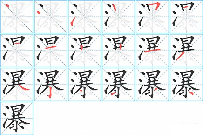 瀑是左右结构,瀑的部首是“氵”,部外笔画15画,总笔画18画,瀑的笔画顺序是“点、点、提、竖、横折、横、横、横、竖、竖、横、撇、捺、竖钩、点、提、撇、点”。看看“瀑”字什么意思 >>
