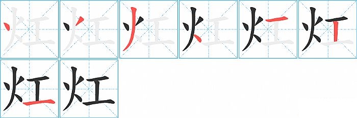 灴是左右结构,灴的部首是“火”,部外笔画3画,总笔画7画,灴的笔画顺序是“点、撇、撇、点、横、竖、横”。
