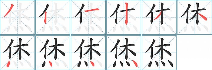 烋是上下结构,烋的部首是“灬”,部外笔画6画,总笔画10画,烋的笔画顺序是“撇、竖、横、竖、撇、捺、点、点、点、点”。