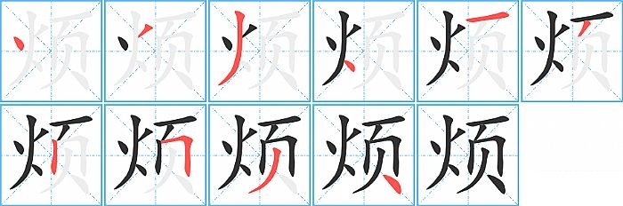 烦是左右结构,烦的部首是“火”,部外笔画6画,总笔画10画,烦的笔画顺序是“点、撇、撇、点、横、撇、竖、横折、撇、点”。