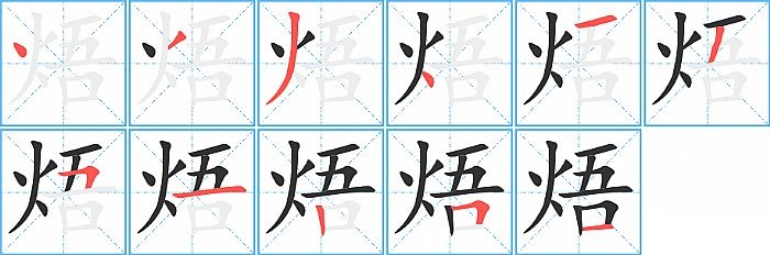 焐是左右结构,焐的部首是“火”,部外笔画7画,总笔画11画,焐的笔画顺序是“点、撇、撇、点、横、竖、横折、横、竖、横折、横”。看看“焐”字什么意思 >>