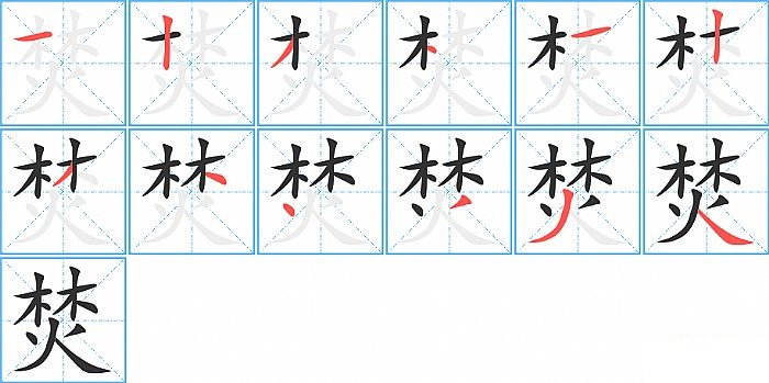 焚是上下结构,焚的部首是“火”,部外笔画8画,总笔画12画,焚的笔画顺序是“横、竖、撇、点、横、竖、撇、点、点、撇、撇、捺”。看看“焚”字什么意思 >>