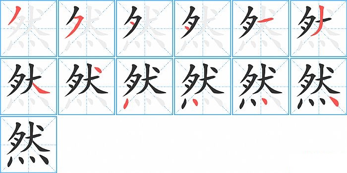 然是上下结构,然的部首是“灬”,部外笔画8画,总笔画12画,然的笔画顺序是“撇、横撇/横钩、点、点、横、撇、捺、点、点、点、点、点”。看看“然”字什么意思 >>
