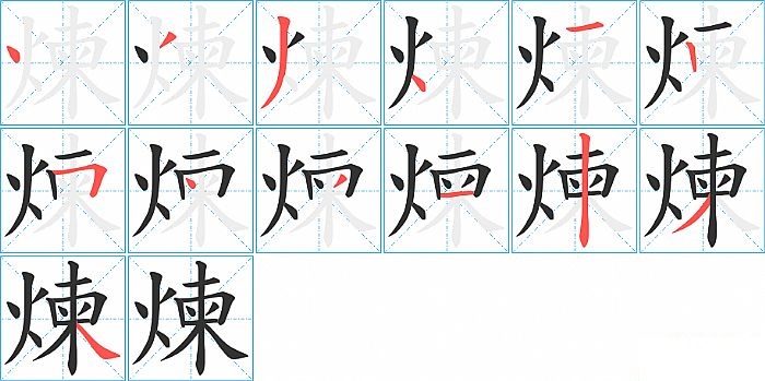 煉是左右结构,煉的部首是“火”,部外笔画9画,总笔画13画,煉的笔画顺序是“点、撇、撇、点、横、竖、横折、点、撇、横、竖、撇、捺”。看看“煉”字什么意思 >>