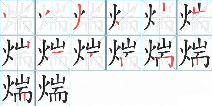 煓是左右结构,煓的部首是“火”,部外笔画9画,总笔画13画,煓的笔画顺序是“点、撇、撇、点、竖、竖折/竖弯、竖、横、撇、竖、横折钩、竖、竖”。看看“煓”字什么意思 >>