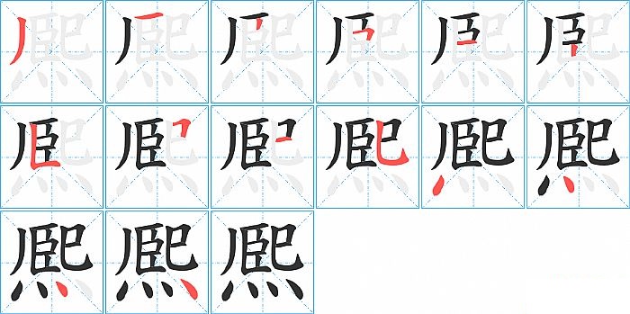 熈是上下结构,熈的部首是“灬”,部外笔画10画,总笔画14画,熈的笔画顺序是“撇、横、竖、横折、横、竖、竖折/竖弯、横折、横、竖弯钩、点、点、点、点”。看看“熈”字什么意思 >>