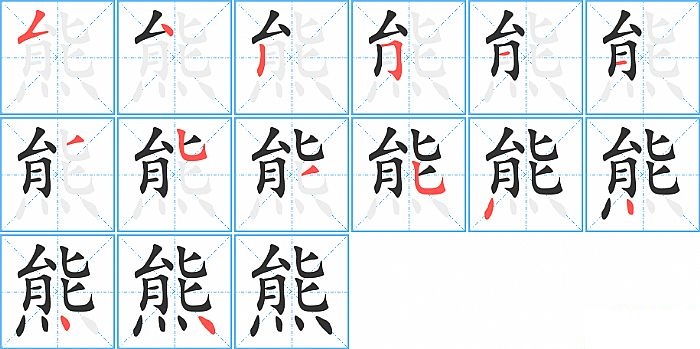 熊是上下结构,熊的部首是“灬”,部外笔画10画,总笔画14画,熊的笔画顺序是“撇折、点、竖、横折钩、横、横、撇、竖弯钩、撇、竖弯钩、点、点、点、点”。看看“熊”字什么意思 >>
