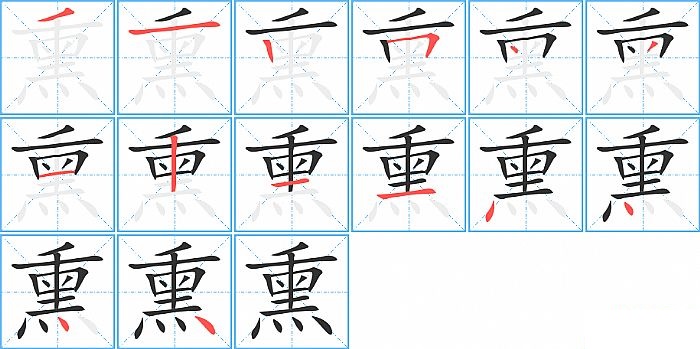 熏是上下结构,熏的部首是“灬”,部外笔画10画,总笔画14画,熏的笔画顺序是“撇、横、竖、横折、点、撇、横、竖、横、横、点、点、点、点”。看看“熏”字什么意思 >>