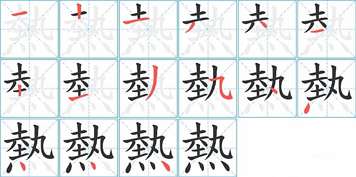 熱是上下结构,熱的部首是“灬”,部外笔画11画,总笔画15画,熱的笔画顺序是“横、竖、横、撇、点、横、竖、提、撇、横折弯钩/横斜钩、点、点、点、点、点”。看看“熱”字什么意思 >>