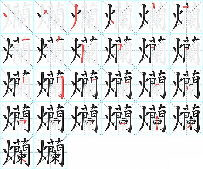 爤是左右结构,爤的部首是“火”,部外笔画20画,总笔画24画,爤的笔画顺序是“点、撇、撇、点、横、竖、竖、横折、横、横、竖、竖、横折钩、横、横、横、竖、横折、点、撇、横、竖、撇、点”。看看“爤”字什么意思 >>
