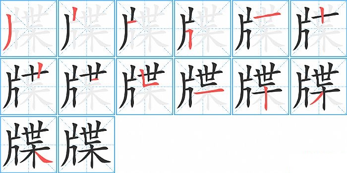 牒是左右结构,牒的部首是“片”,部外笔画9画,总笔画13画,牒的笔画顺序是“撇、竖、横、横折、横、竖、竖、横、竖折/竖弯、横、竖、撇、捺”。看看“牒”字什么意思 >>