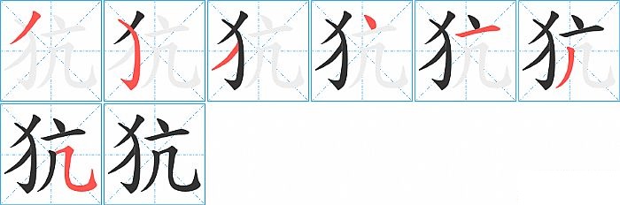 犺是左右结构,犺的部首是“犭”,部外笔画4画,总笔画7画,犺的笔画顺序是“撇、弯钩、撇、点、横、撇、横折弯钩/横斜钩”。