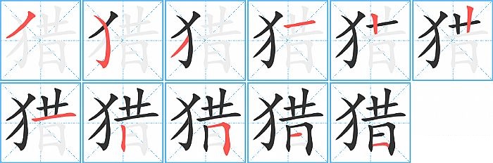 猎是左右结构,猎的部首是“犭”,部外笔画8画,总笔画11画,猎的笔画顺序是“撇、弯钩、撇、横、竖、竖、横、竖、横折、横、横”。看看“猎”字什么意思 >>