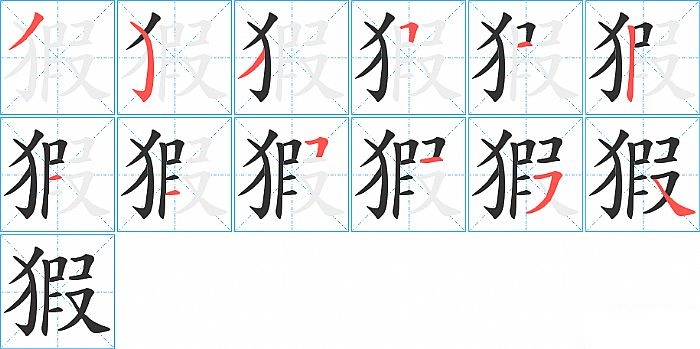 猳是左右结构,猳的部首是“犭”,部外笔画9画,总笔画12画,猳的笔画顺序是“撇、弯钩、撇、横折、横、竖、横、横、横折、横、横撇/横钩、捺”。看看“猳”字什么意思 >>