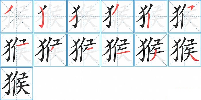 猴是左右结构,猴的部首是“犭”,部外笔画9画,总笔画12画,猴的笔画顺序是“撇、弯钩、撇、撇、竖、横折、横、撇、横、横、撇、捺”。看看“猴”字什么意思 >>