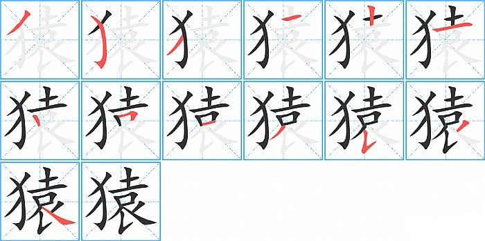 猿是左右结构,猿的部首是“犭”,部外笔画10画,总笔画13画,猿的笔画顺序是“撇、弯钩、撇、横、竖、横、竖、横折、横、撇、竖提、撇、捺”。看看“猿”字什么意思 >>