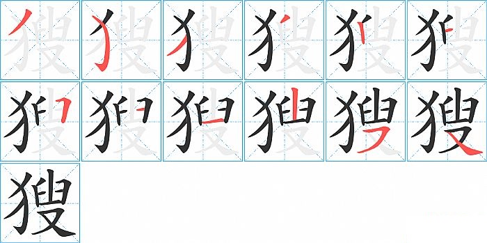 獀是左右结构,獀的部首是“犭”,部外笔画9画,总笔画12画,獀的笔画顺序是“撇、弯钩、撇、撇、竖、横、横折、横、横、竖、横撇/横钩、捺”。看看“獀”字什么意思 >>