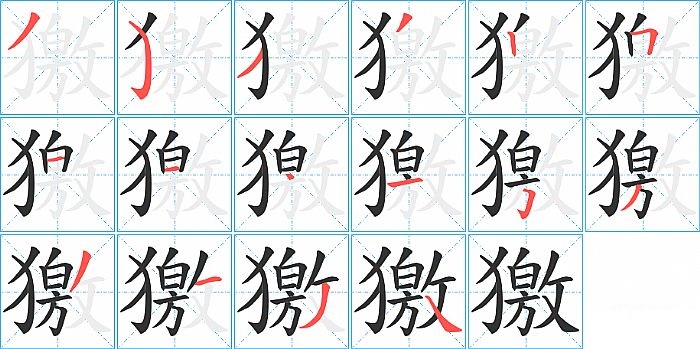 獥是左右结构,獥的部首是“犭”,部外笔画13画,总笔画16画,獥的笔画顺序是“撇、弯钩、撇、撇、竖、横折、横、横、点、横、横折钩、撇、撇、横、撇、捺”。看看“獥”字什么意思 >>