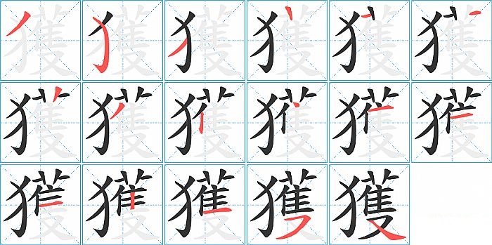 獲是左右结构,獲的部首是“犭”,部外笔画13画,总笔画16画,獲的笔画顺序是“撇、弯钩、撇、横、竖、竖、撇、竖、点、横、横、横、竖、横、横撇/横钩、捺”。看看“獲”字什么意思 >>