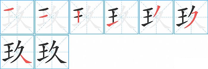 玖是左右结构,玖的部首是“王”,部外笔画3画,总笔画7画,玖的笔画顺序是“横、横、竖、提、撇、横撇/横钩、捺”。