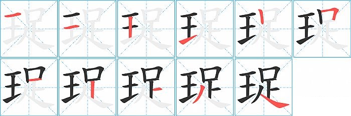 珿是左右结构,珿的部首是“王”,部外笔画7画,总笔画11画,珿的笔画顺序是“横、横、竖、提、竖、横折、横、竖、横、撇、捺”。看看“珿”字什么意思 >>