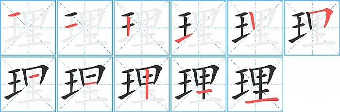 理是左右结构,理的部首是“王”,部外笔画7画,总笔画11画,理的笔画顺序是“横、横、竖、提、竖、横折、横、横、竖、横、横”。看看“理”字什么意思 >>