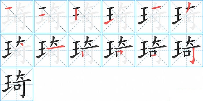 琦是左右结构,琦的部首是“王”,部外笔画8画,总笔画12画,琦的笔画顺序是“横、横、竖、提、横、撇、点、横、竖、横折、横、竖钩”。看看“琦”字什么意思 >>