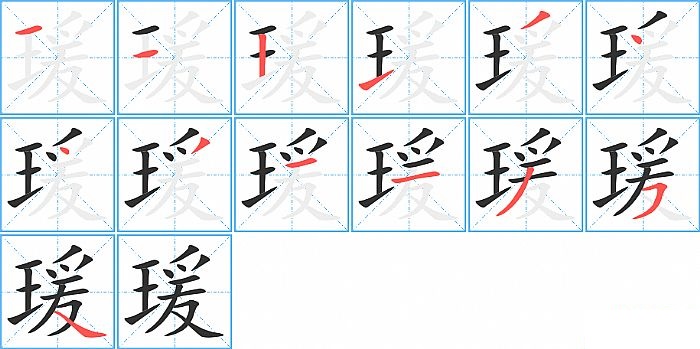 瑗是左右结构,瑗的部首是“王”,部外笔画9画,总笔画13画,瑗的笔画顺序是“横、横、竖、提、撇、点、点、撇、横、横、撇、横撇/横钩、捺”。看看“瑗”字什么意思 >>