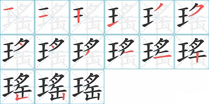 瑤是左右结构,瑤的部首是“王”,部外笔画10画,总笔画14画,瑤的笔画顺序是“横、横、竖、提、撇、横撇/横钩、点、点、撇、横、横、竖、竖折/竖弯、竖”。看看“瑤”字什么意思 >>