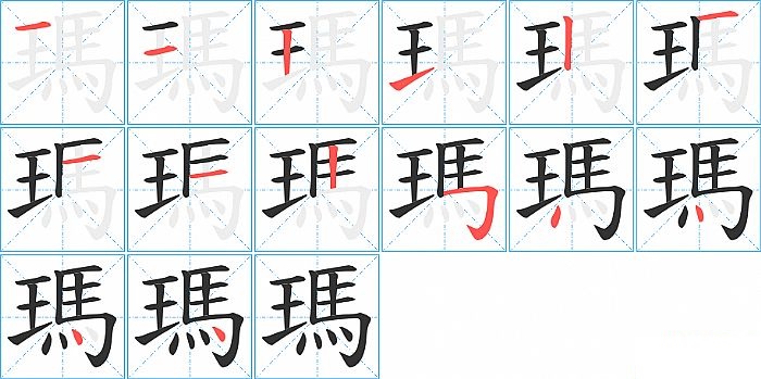 瑪是左右结构,瑪的部首是“王”,部外笔画10画,总笔画14画,瑪的笔画顺序是“横、横、竖、提、横、竖、横、横、竖、横折钩、点、点、点、点”。看看“瑪”字什么意思 >>