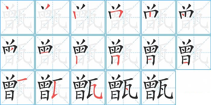 甑是左右结构,甑的部首是“瓦”,部外笔画12画,总笔画16画,甑的笔画顺序是“点、撇、竖、横折、竖、点、撇、横、竖、横折、横、横、横、竖提、横折弯钩/横斜钩、点”。看看“甑”字什么意思 >>