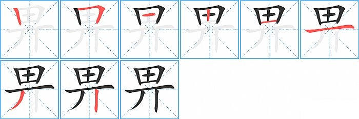 畀是上下结构,畀的部首是“田”,部外笔画3画,总笔画8画,畀的笔画顺序是“竖、横折、横、竖、横、横、撇、竖”。