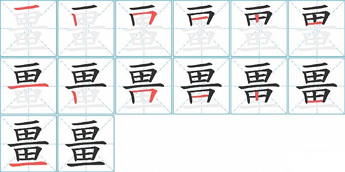 畺是上中下结构,畺的部首是“田”,部外笔画8画,总笔画13画,畺的笔画顺序是“横、竖、横折、横、竖、横、横、竖、横折、横、竖、横、横”。看看“畺”字什么意思 >>