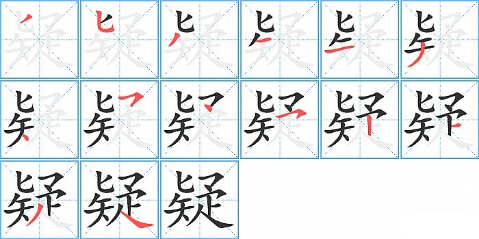 疑是左右结构,疑的部首是“疋”,部外笔画9画,总笔画14画,疑的笔画顺序是“撇、竖弯钩、撇、横、横、撇、点、横撇/横钩、点、横撇/横钩、竖、横、撇、捺”。看看“疑”字什么意思 >>