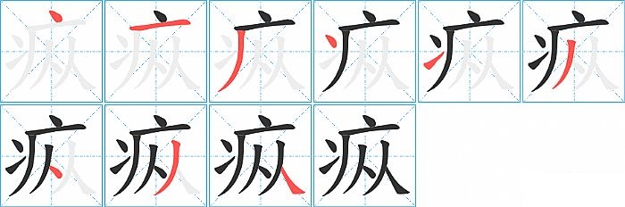 疭是半包围结构,疭的部首是“疒”,部外笔画4画,总笔画9画,疭的笔画顺序是“点、横、撇、点、提、撇、点、撇、捺”。