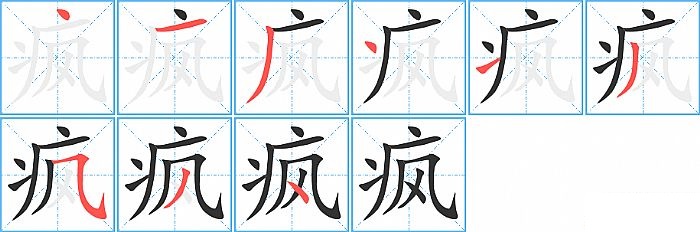 疯是半包围结构,疯的部首是“疒”,部外笔画4画,总笔画9画,疯的笔画顺序是“点、横、撇、点、提、撇、横折弯钩/横斜钩、撇、点”。看看“疯”字什么意思 >>