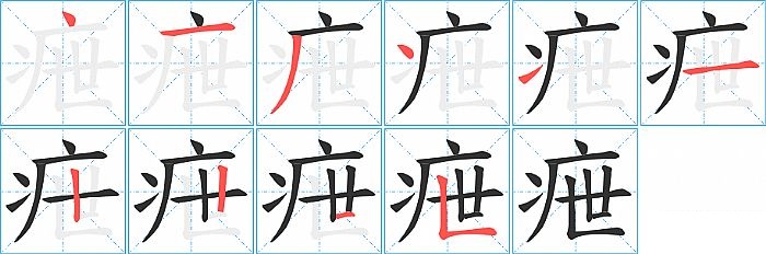 疶是左上包围结构,疶的部首是“疒”,部外笔画5画,总笔画10画,疶的笔画顺序是“点、横、撇、点、提、横、竖、竖、横、竖折/竖弯”。看看“疶”字什么意思 >>
