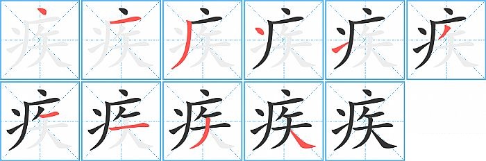 疾是半包围结构,疾的部首是“疒”,部外笔画5画,总笔画10画,疾的笔画顺序是“点、横、撇、点、提、撇、横、横、撇、捺”。