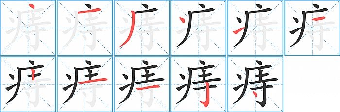 痔是半包围结构,痔的部首是“疒”,部外笔画6画,总笔画11画,痔的笔画顺序是“点、横、撇、点、提、横、竖、横、横、竖钩、点”。看看“痔”字什么意思 >>