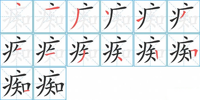痴是半包围结构,痴的部首是“疒”,部外笔画8画,总笔画13画,痴的笔画顺序是“点、横、撇、点、提、撇、横、横、撇、点、竖、横折、横”。看看“痴”字什么意思 >>