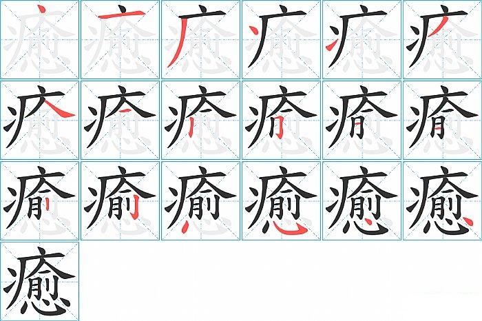 癒是左上包围结构,癒的部首是“疒”,部外笔画13画,总笔画18画,癒的笔画顺序是“点、横、撇、点、提、撇、捺、横、竖、横折钩、横、横、竖、竖钩、点、斜钩、点、点”。看看“癒”字什么意思 >>