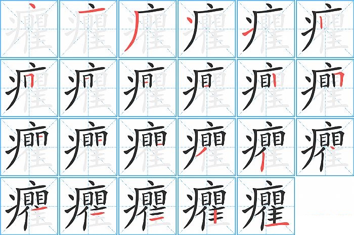 癯是半包围结构,癯的部首是“疒”,部外笔画18画,总笔画23画,癯的笔画顺序是“点、横、撇、点、提、竖、横折、横、横、横、竖、横折、横、横、横、撇、竖、点、横、横、横、竖、横”。看看“癯”字什么意思 >>