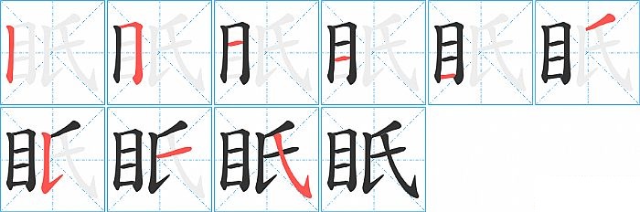 眂是左右结构,眂的部首是“目”,部外笔画4画,总笔画9画,眂的笔画顺序是“竖、横折、横、横、横、撇、竖提、横、斜钩”。