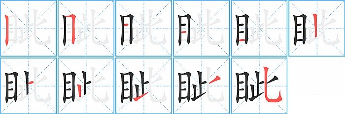 眦是左右结构,眦的部首是“目”,部外笔画6画,总笔画11画,眦的笔画顺序是“竖、横折、横、横、横、竖、横、竖、提、撇、竖弯钩”。看看“眦”字什么意思 >>