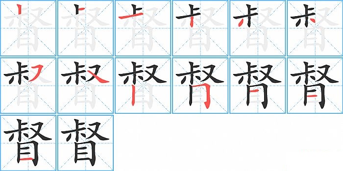 督是上下结构,督的部首是“目”,部外笔画8画,总笔画13画,督的笔画顺序是“竖、横、横、竖、撇、点、横撇/横钩、捺、竖、横折、横、横、横”。看看“督”字什么意思 >>