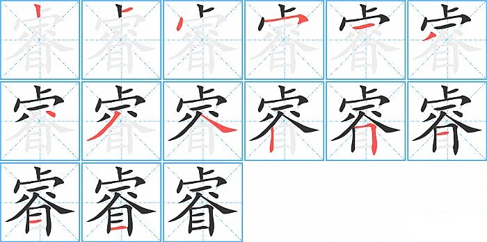 睿是上下结构,睿的部首是“目”,部外笔画9画,总笔画14画,睿的笔画顺序是“竖、横、点、横撇/横钩、横、撇、点、撇、捺、竖、横折、横、横、横”。看看“睿”字什么意思 >>